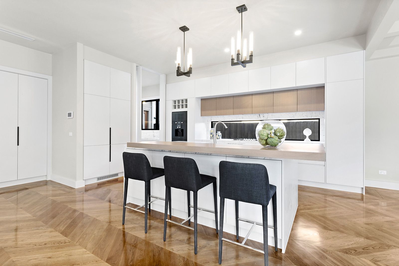 Reflecting a perfectionist’s approach to exclusive living, the expansive family room/meals extends out via two bi-fold doors to a seductive alfresco with outdoor kitchen, sauna, bathroom and solar-heated pool. A chef’s paradise, the brilliant marble kitchen with second kitchen, Miele and Gaggenau appliances and an integrated fridge/freezer is an impressive centrepiece.